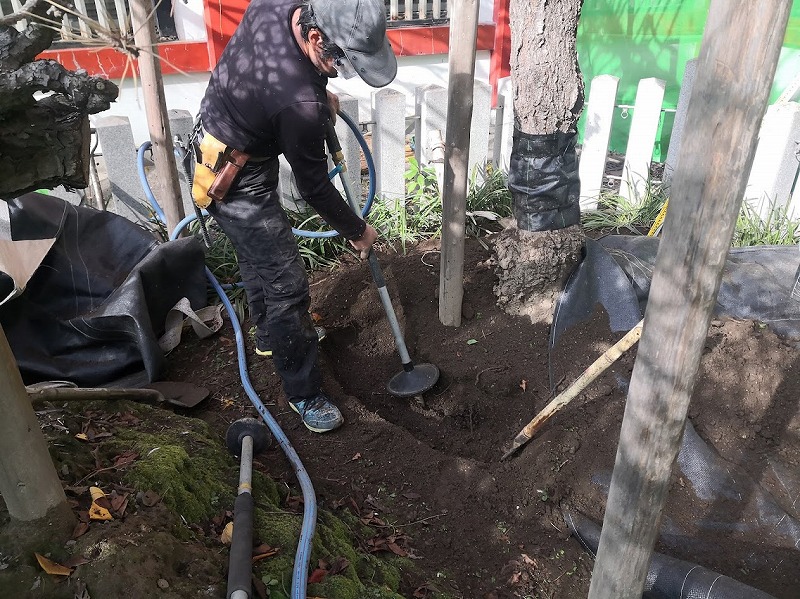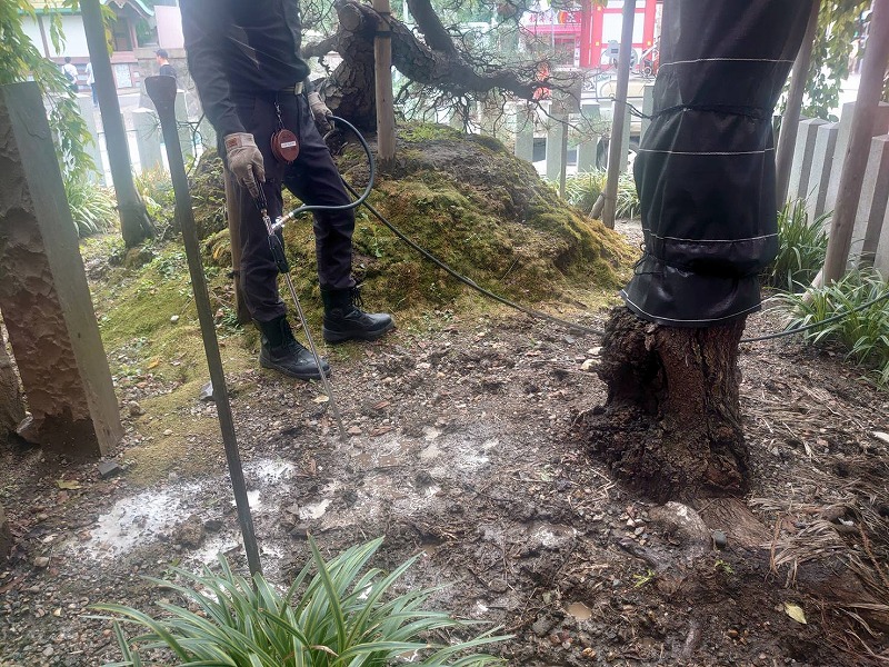 | ひょんなことから大須観音の境内にある立派なシダレサクラを開花させるという仕事に携わることになった。 大須観音と言えば、名古屋市中区大須にあり、大須通りは有名な繁華街である。 何故そんな有名どころの仕事が迷い込んだのか? 実は、三重県にも 『津観音』 というプチ有名どころの観音様がある。数年前に、そこにあるゴヨウマツを診断・治療した経緯がある。もちろん上手くいった。 そんな観音様繋がりで、石黒が紹介されたということです(もちろん紹介者は間に入っている)。 そんなところの咲かないサクラを『開花をさせてくれ!』となると、通常の仕事よりもプレッシャーが上乗せされるのはいうまでもない。 さてさて、上手く行くのだろうか・・・・? |