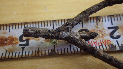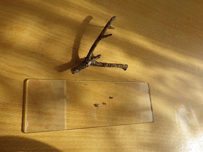 枝を見ると何やら、黒いものがびっしり付いている。 なんだこれ?? とにかく、持って帰って調べてみよう。