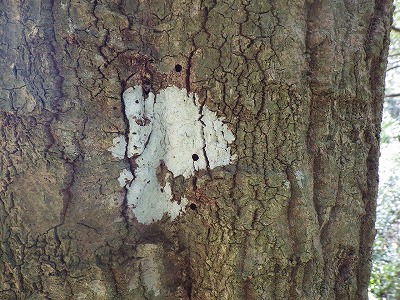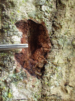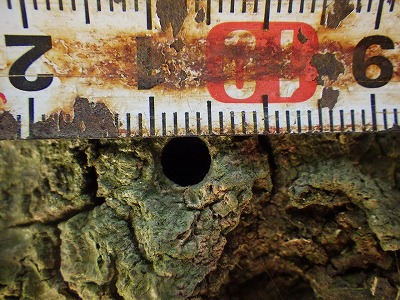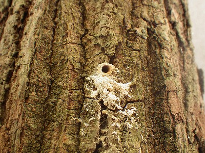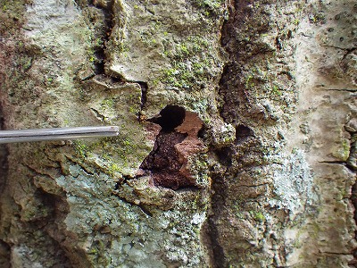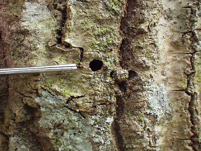 問題の孔はこれか。 う〜ん。 カシノナガキクイムシで無い事は、すぐに判別できたが・・・・では、一体ナンなんだ!