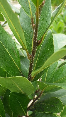 上記の月桂樹に薬剤散布を行いました。 散布日は7月10日です。 自社圃場にて、診断で実際に説明したやり方と全く同じ方法で行いました。