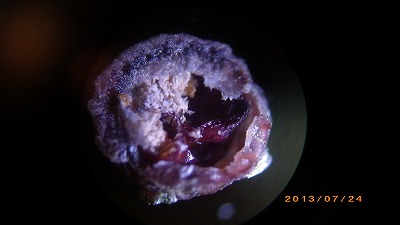 ルビーロウムシが生きていれば、右の写真のように穴を空けた時に、中身の体液(??)か、赤い汁が出てきますが