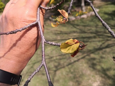 この原因は何か? 一旦は開花し葉も展開し始めた・・・が、一気に枯死に向かった。つまり、これは葉が展開し一気に蒸散量が増加したが