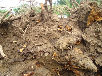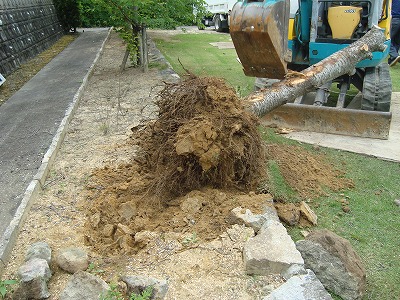 | 枝を払った後、重機で幹を引くと簡単に抜けた。 根の支持力が無い証拠。 |