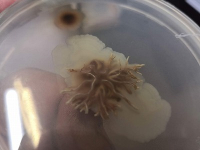 採取した根を持ち帰り、同定するために組織培養を試みた。